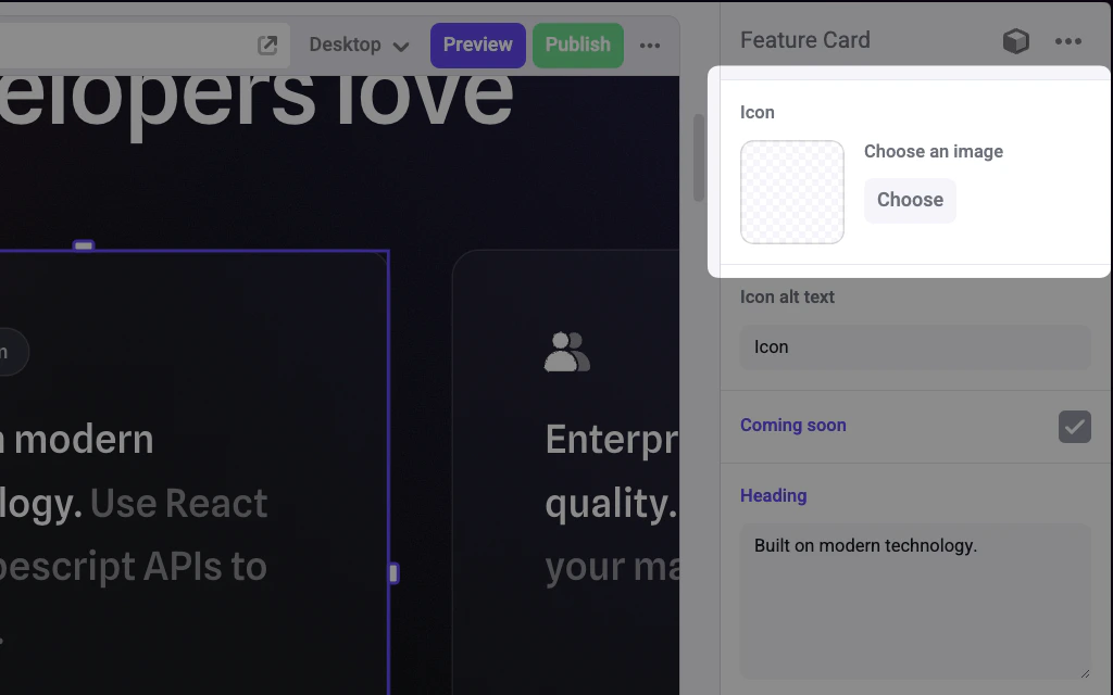 The following examples adds an Image control to theicon prop of a Feature Card component.