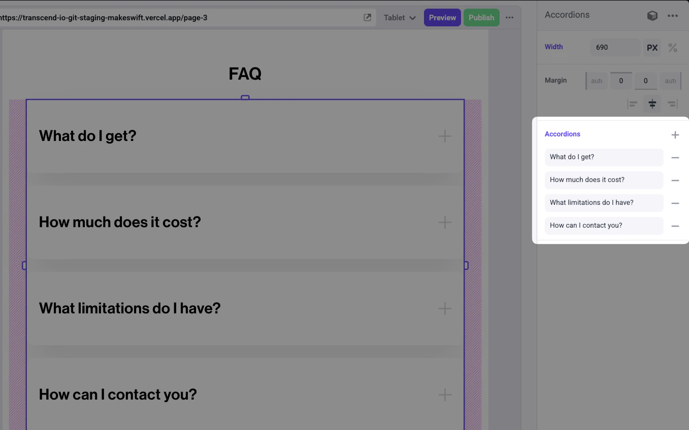 This example adds an List control to theaccordionTitles prop of an Accordions component.